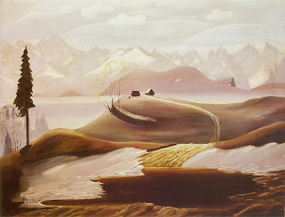 Malczewski joined the Podhale Arts Society, which promoted the idea of seeking out foundations for Polish art in the local folk culture. He designed productions for the Formist Theatre which began operating in Zakopane in 1925, creating scenery for the plays of Witkiewicz and Strindberg. Malczewski first exhibited his works in public in 1924 in Warsaw. Other exhibitions followed in many Polish cities. During the interwar period Malczewski gained considerable fame as a painter, presenting his work at the Biennale in Venice in 1932, in Berlin, Helsinki, Los Angeles, Moscow, and New York. He won a gold medal for his painting Spring in the Mountains (below) at the World Exhibition of Art and Technology in Paris in 1937.
